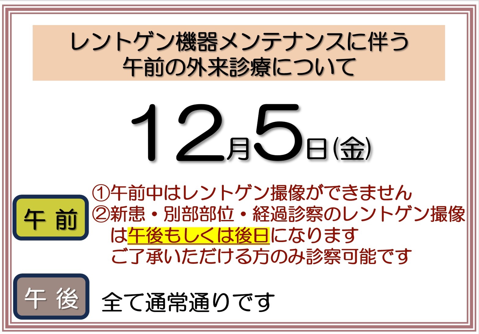 レントゲン機器メンテナンスに伴う午前の外来診療について