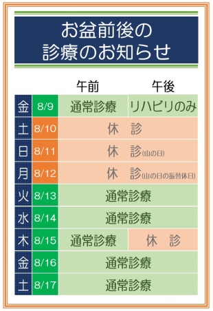 令和7年3月 診療時間変更のお知らせ 2025.02.19(水)更新 令和6年12月 土曜午後 リハビリ終了のお知らせ 2024.12.07(土)更新 令和6年10月 代診のお知らせ 2024.10.05(土)更新 令和6年10月 診療時間変更のお知らせ 2024.10.05(土)更新 令和6年8月 お盆前後の診療のお知らせ 2024.07.24(水)更新 全 52 件中 6 〜 10 件目を表示 1, 2, 3, 4, 5 ...11 « 前の5件 次の5件 »